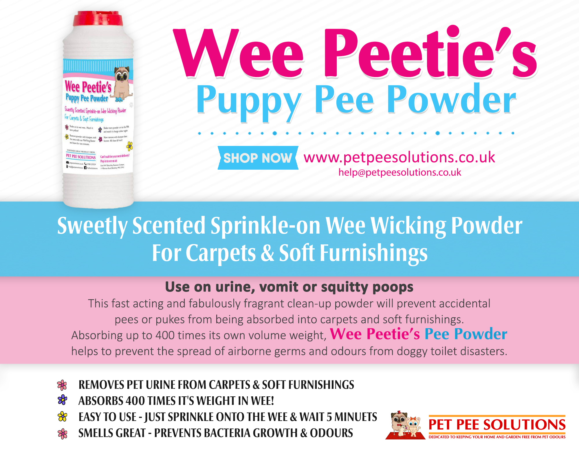 Sweetly Scented Sprinkle-on Wee Wicking PowderAbsorbs pet pee from carpets & soft furnishings