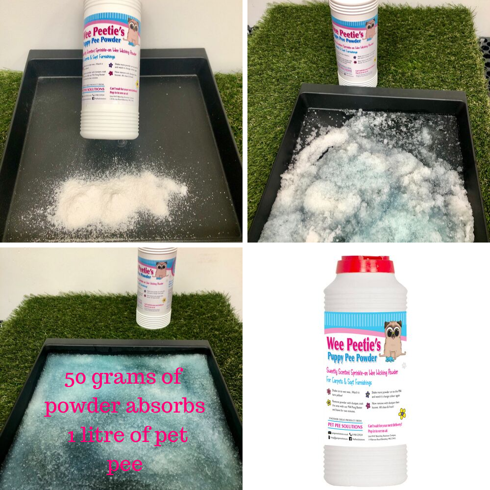Absorbing up to 400 times its own volume weight, Wee Peetie’s Pee Powder helps to prevent the spread of airborne germs and odours from doggy toilet disasters.