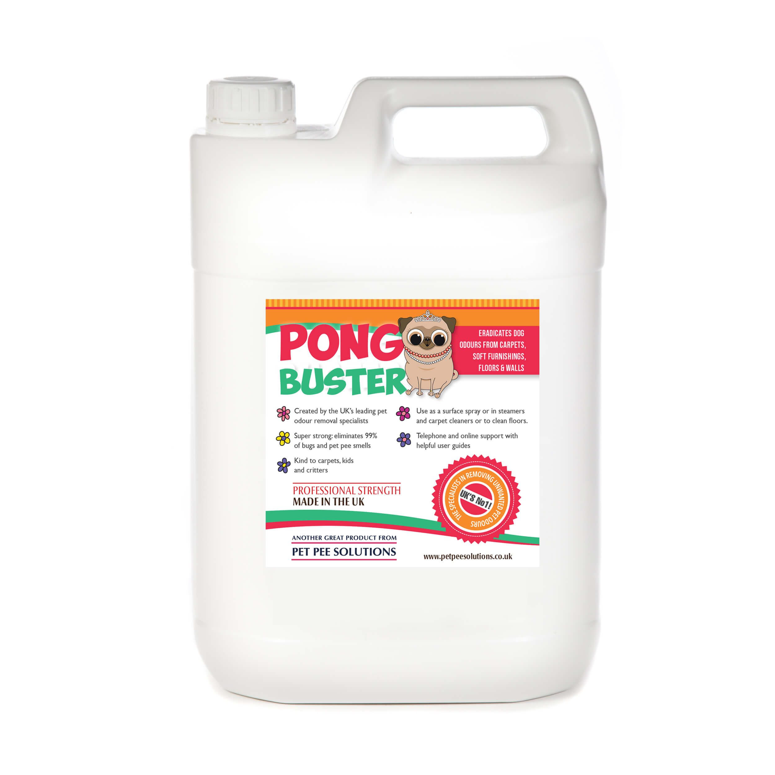 Pong Buster can be used indoors on all floors, carpets and upholstery to remove urine and faeces odours and resulting germs.